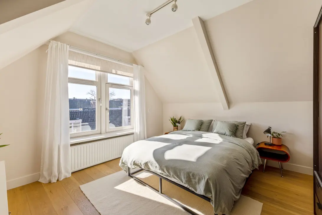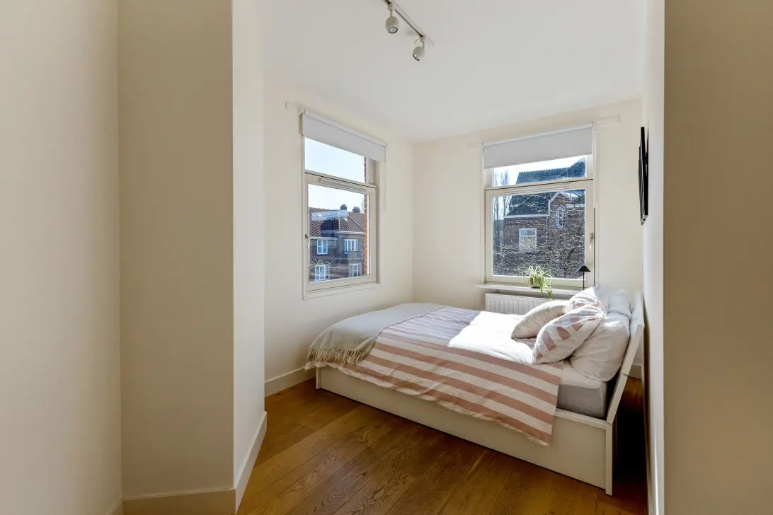Via een interne trap is de vierde en bovenste verdieping te bereiken. Hier bevinden zich twee slaapkamers. De royale master bedroom is bijzonder sfeervol dankzij de prachtige karakteristieke houten balken, waardoor modern wooncomfort op een speelse wijze wordt gecombineerd met originele details. Daarnaast bevindt zich op deze verdieping een derde, compacte slaapkamer die zich uitstekend leent als kinder-, logeer- of werkkamer. De tweede slaapkamer qua formaat bevindt zich op de benedenverdieping (derde verdieping) en heeft eveneens een prettig formaat.
