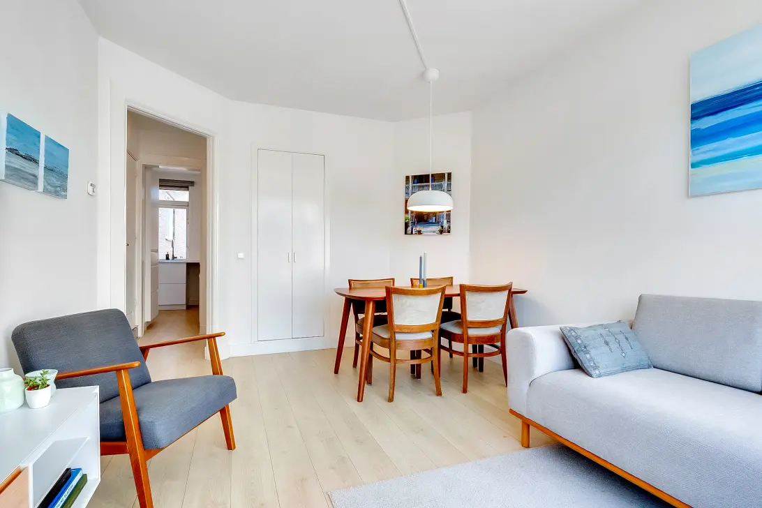Via het brede gemeenschappelijke trappenhuis bereik je de entree van het appartement op de tweede verdieping. Het appartement heeft een woonoppervlakte van circa 39 m² en is opvallend efficiënt ingedeeld, waardoor de woning ruimer aanvoelt dan de vierkante meters doen vermoeden. Wat direct opvalt is de grote hoeveelheid natuurlijk licht die de woning binnenstroomt, wat sterk bijdraagt aan het ruimtelijke en prettige woongevoel.