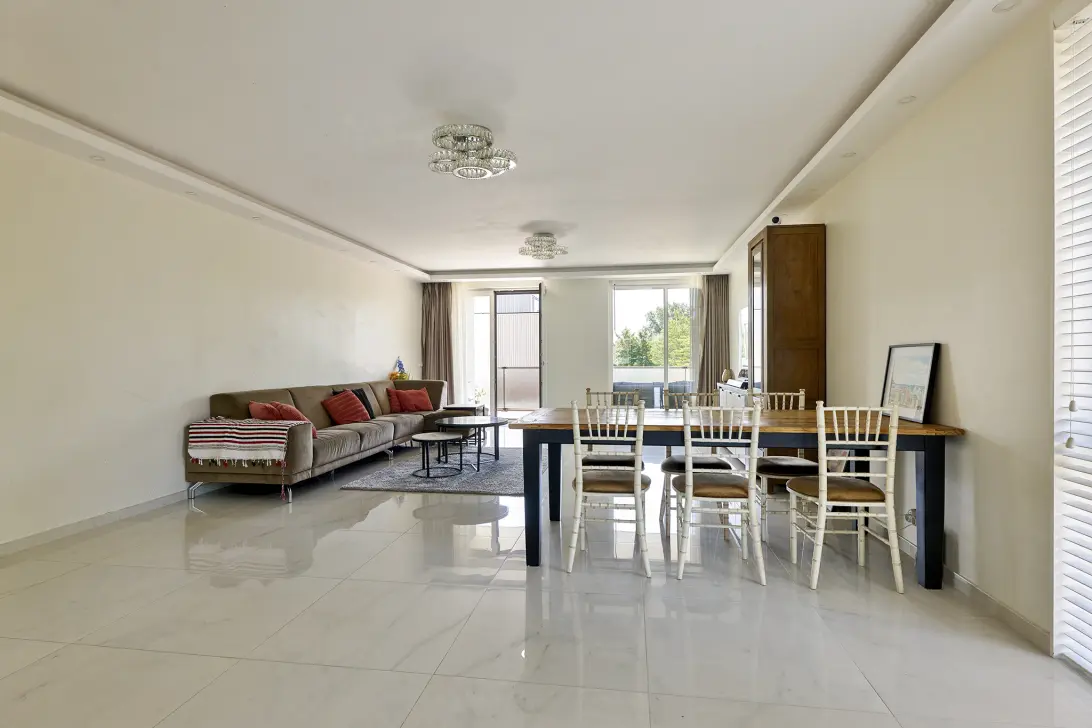 On the corner is the very big living room with an open-plan kitchen, which is very bright thanks to the many large windows. The kitchen features a cooking island, ample storage space, and various built-in appliances. The living room opens onto a 13 m² terrace.