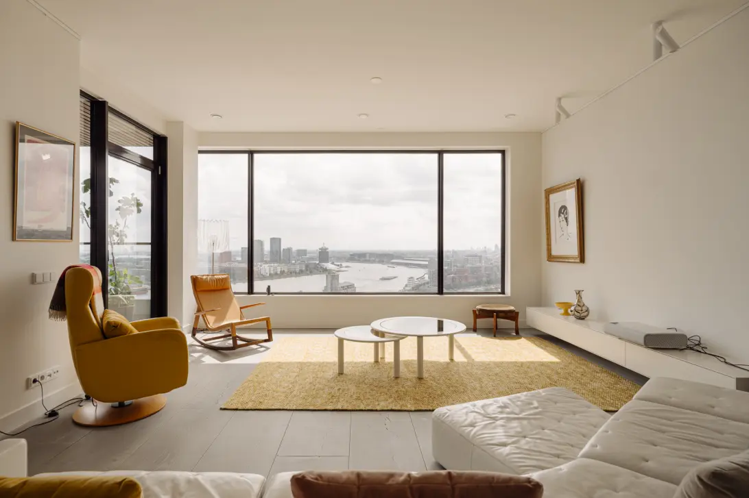 Entree, hal, garderobe, riante woonkamer met geweldig uitzicht en volledig glasoppervlak van vloer tot plafond.