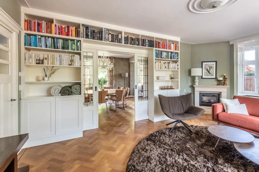 Entree, vestibule met garderobe en glazen deur naar de gang, wc met fonteintje, provisiekast en een kelder. De woonkamer en suite heeft een met halfronde erker, een open haard, een fraaie eikenhouten visgraat parketvloer, ingebouwde boekenkast, schuifdeuren en openslaande deuren naar de tuin. De eigentijdse open keuken is voorzien van diverse inbouwapparatuur en sluit ook aan op de tuin.