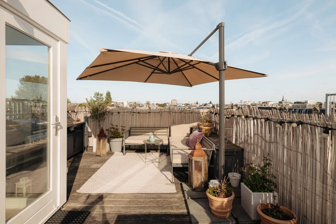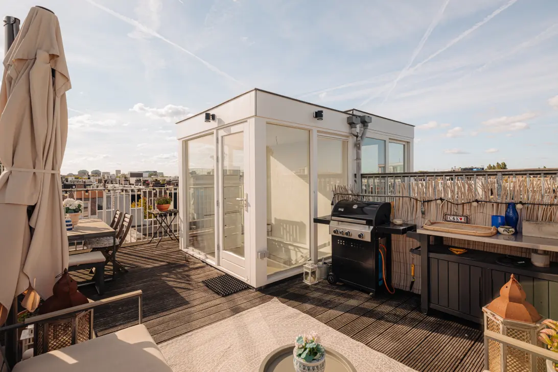 The entrance on the second floor leads via an internal staircase to the living floor on the fourth level. The bright living room with open kitchen offers ample space for a comfortable seating and dining area, ideal for relaxed evenings or dinners with friends. At the rear is the spacious bedroom, featuring large windows that provide maximum natural light and a serene view. The bathroom is cleverly designed with a luxurious walk-in shower, sink, and toilet. Thanks to the efficient layout, every square meter is optimally utilized, and the generous 25 m² rooftop terrace offers breathtaking panoramic views over Amsterdam's rooftops – perfect for sunny afternoons or stargazing.