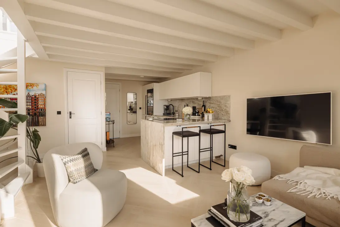 De entree op de tweede verdieping leidt via een interne trap naar de woonverdieping op de vierde etage. De lichte woonkamer met open keuken biedt volop ruimte voor een comfortabele zit- en eethoek, ideaal voor ontspannen avonden of etentjes met vrienden. Aan de achterzijde bevindt zich de ruime slaapkamer, voorzien van grote ramen die zorgen voor maximale lichtinval en een sereen uitzicht. De badkamer is slim ingericht met een luxe inloopdouche, wastafel en toilet. Dankzij de efficiënte indeling wordt elke vierkante meter optimaal benut, en het royale dakterras van 25 m² biedt een adembenemend panorama over de Amsterdamse daken – perfect voor zonnige middagen of sterrenkijken.