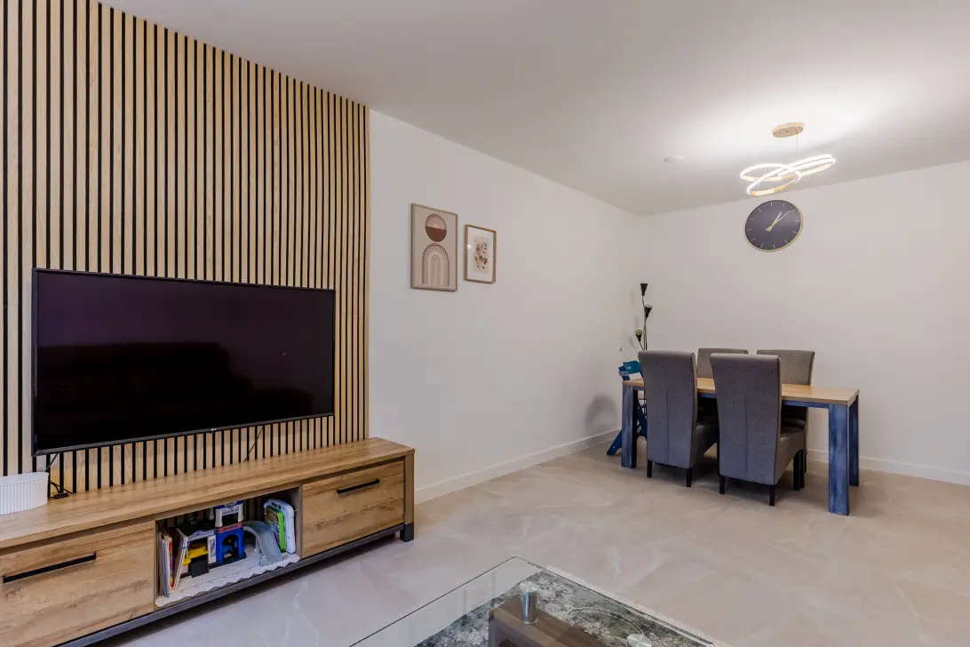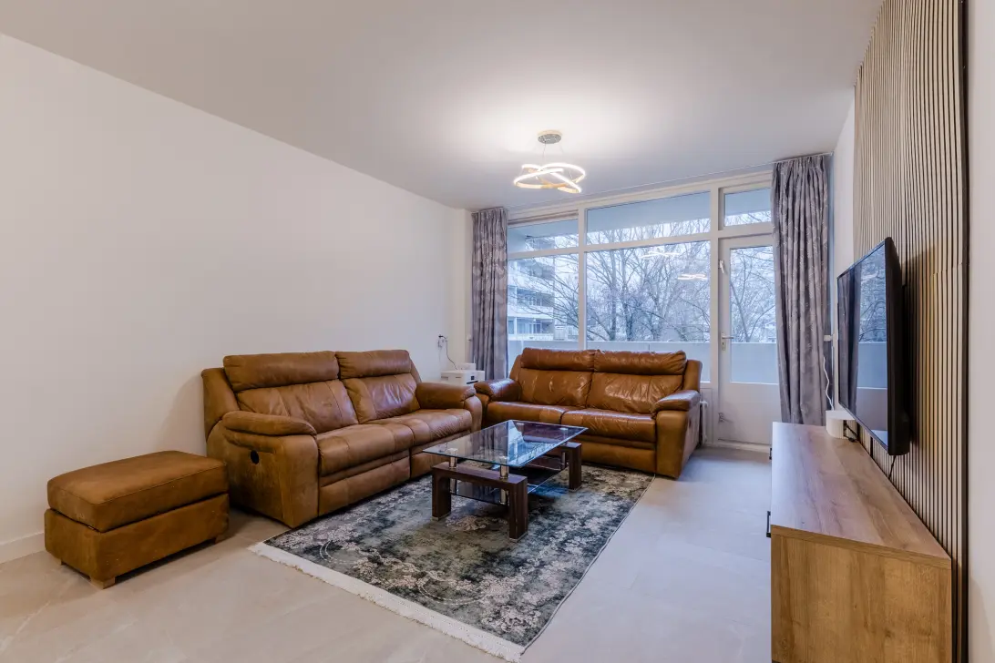 In de ruime woonkamer zijn de wanden strak afgewerkt en deels voorzien van moderne wandpanelen. De brede raampartij met openslaande balkondeur zorgt voor een geweldige lichtinval. Het balkon ligt over de gehele breedte van het appartement en biedt genoeg ruimte voor een gezellig zitje. Dankzij de beschutting aan beide kanten geniet je hier in alle rust van het lekkere weer.