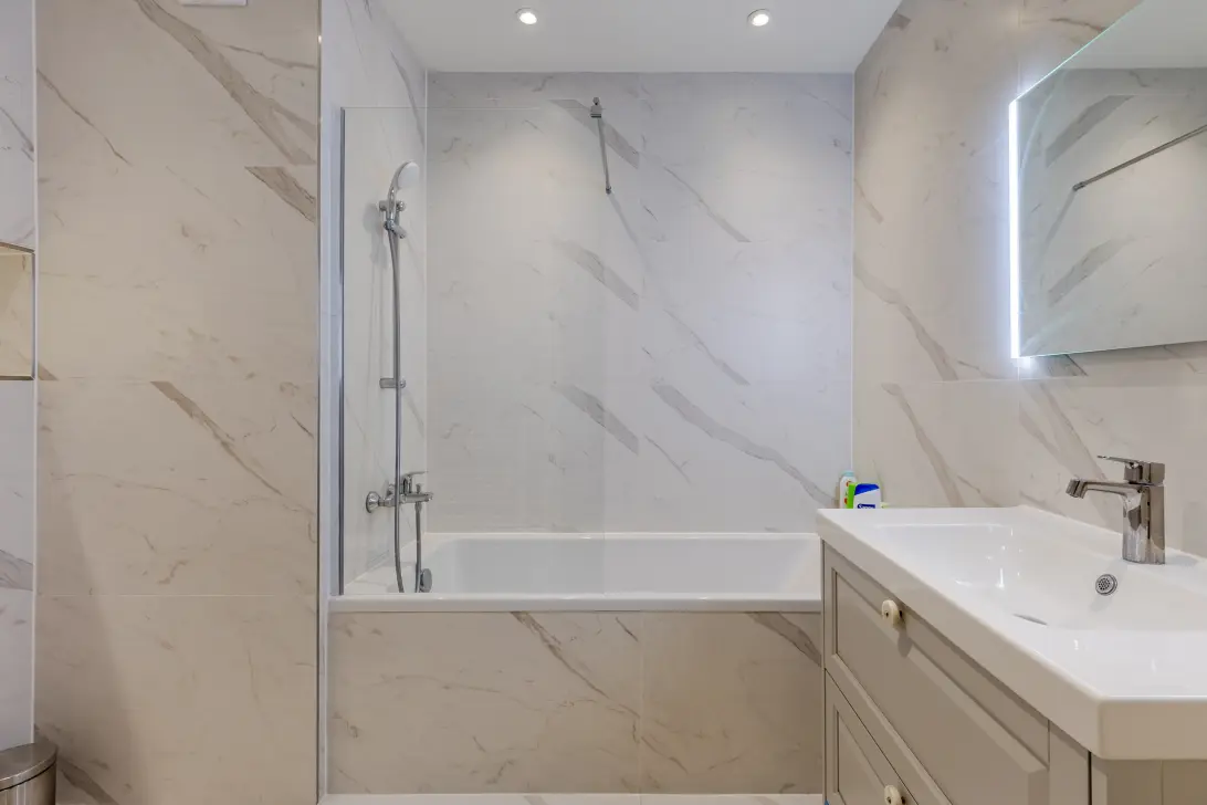 Het appartement beschikt over drie slaapkamers. Deze kamers zijn ruim van formaat, keurig afgewerkt en heerlijk licht. De badkamer is centraal gelegen en is in 2024 volledig vernieuwd. Deze ruimte is luxe afgewerkt met lichte, marmerlook tegels. Hier tref je een zwevend toilet, badmeubel met wastafel, designradiator en ligbad aan. De badkamer wordt verlicht met inbouwspots. Naast de badkamer bevindt zich nog een bergkast met daarin de wasmachine- en drogeraansluitingen.