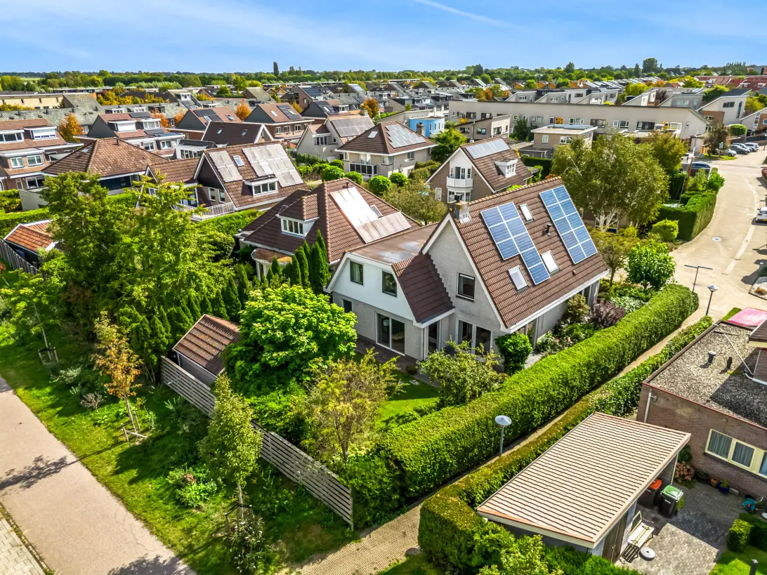 De fraai aangelegde, volop privacy biedende achtertuin heeft een gunstige zonligging. Achter in de tuin staat een houten berging met overkapping. Aan de voorzijde van de woning bevindt zich parkeergelegenheid voor meerdere auto's op eigen erf.