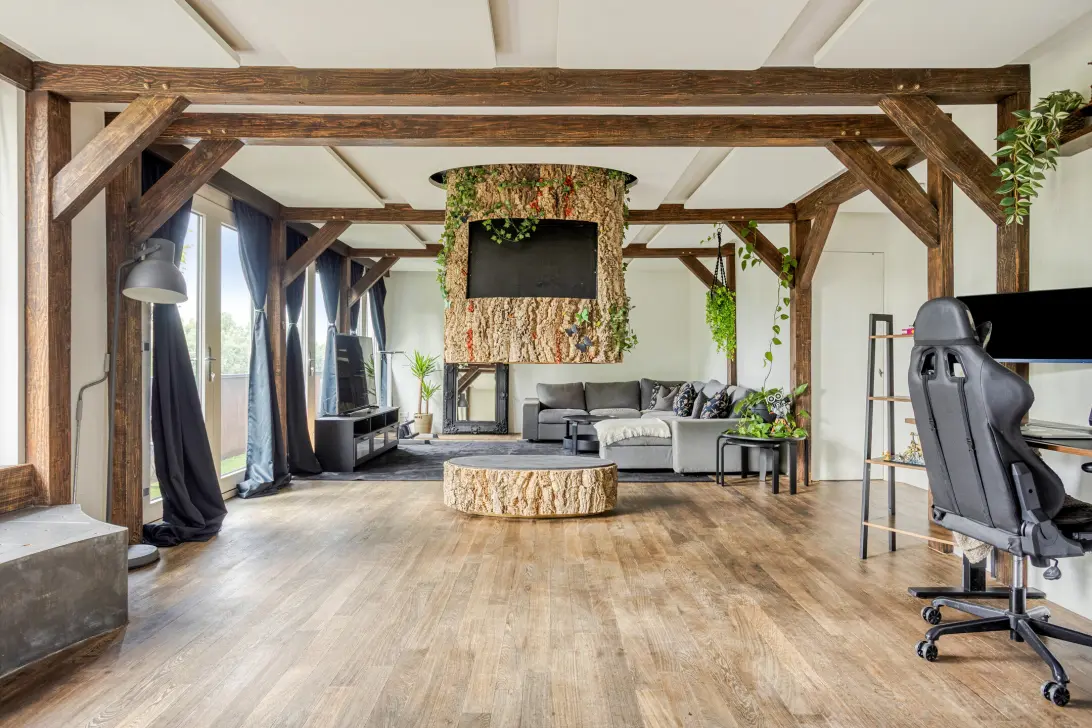 Eenmaal boven loop je de woonkamer in, met prachtige gebinten en balken waar een klassieke pen-gat verbinding is gebruikt. Verder zie je een houten vloer met karakter, een organisch vormgegeven bank met bergruimte en meerdere dubbele deuren naar het balkon. Maar het meest bijzondere element staat midden in de woonkamer… het lijkt op een boom, maar het kan gerust een kunstwerk genoemd worden.