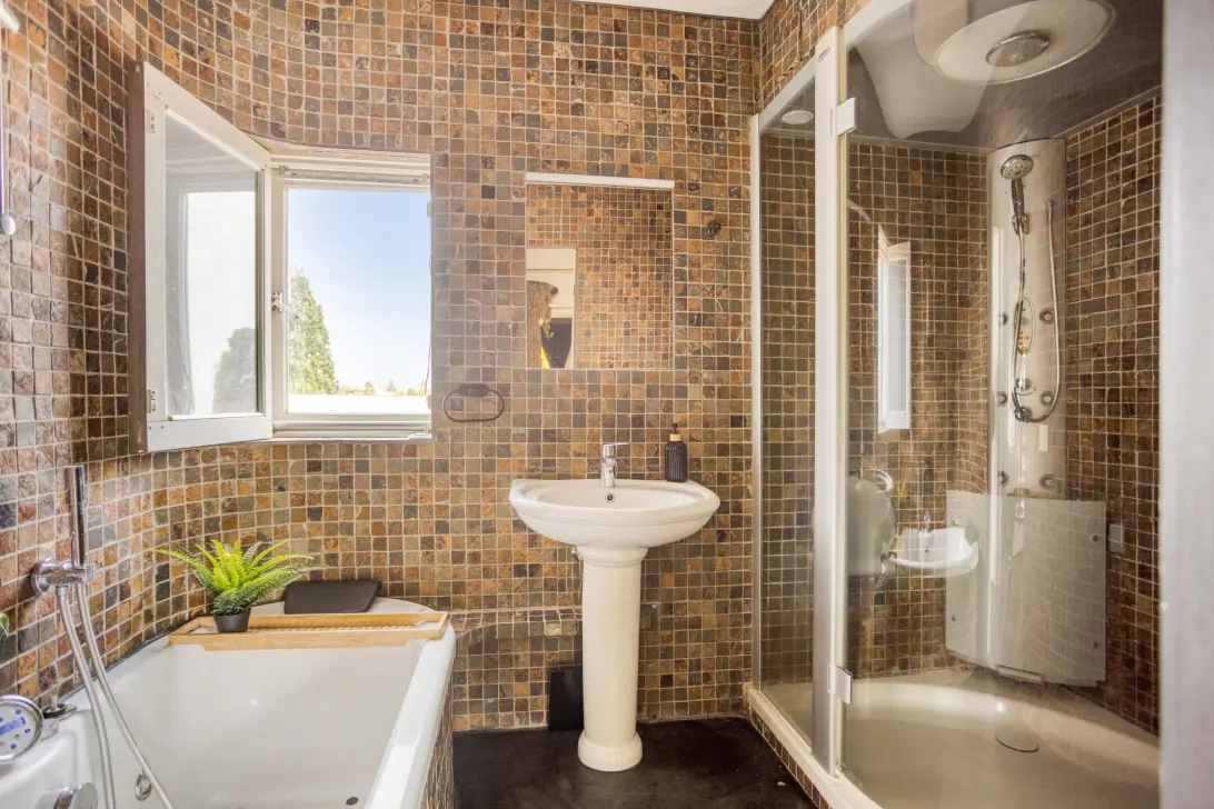 Dan de badkamer, met afgeronde muren en bruine tegeltjes van natuursteen. Blikvanger is het bad met whirlpool, en verder zie je een luxe douche met wandstralen, een toilet en een wastafel op een zuil. Zo zie je maar, niets in dit appartement is standaard…