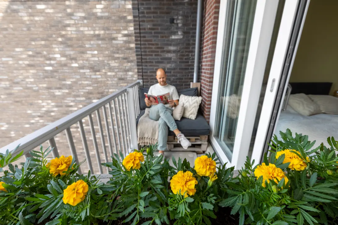 Het eigen balkon op het westen is perfect voor een rustig moment aan het einde van de dag. En als je wat meer ruimte wilt, is er het gezamenlijke dakterras met prachtig uitzicht over de stad — een ideale plek om met vrienden of buren te genieten.