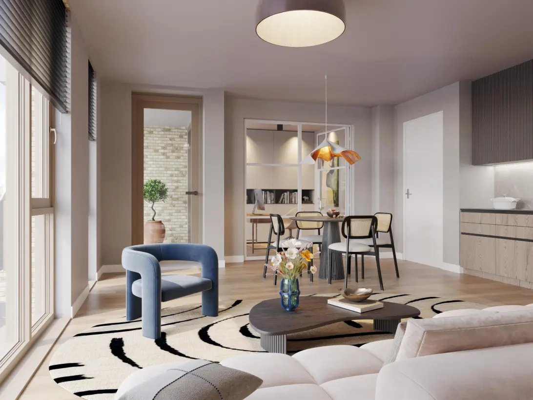 De royale woonkamer vormt het hart van het appartement. De open keuken biedt de mogelijkheid voor voldoende werkruimte en inbouwapparatuur. Een perfecte plek om te koken en te genieten van maaltijden met vrienden of familie.