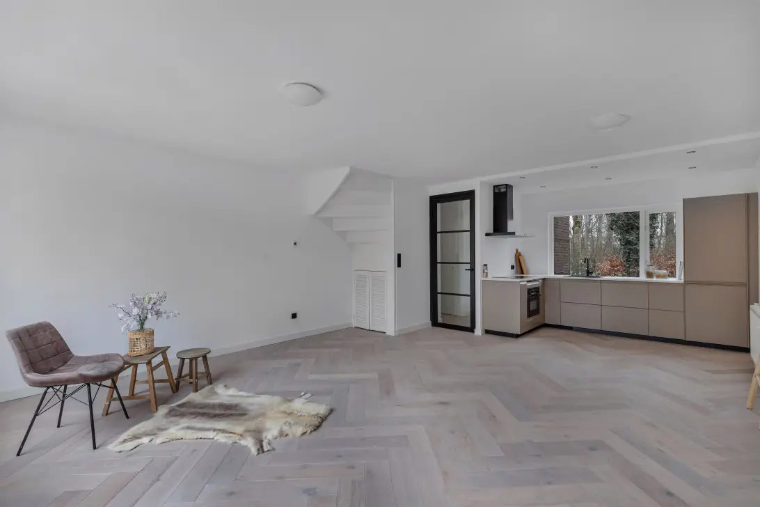 De woonkamer is met smaak verbouwd. De woonkamer aan de achterzijde met zicht op de zonnige tuin op het zuiden en de nieuwe keuken aan de voorzijde met divers inbouwapparatuur en een schitterend uitzicht over het park.