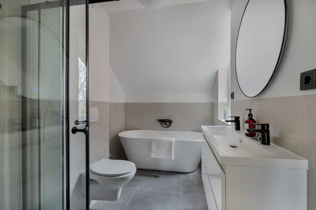 De overloop biedt toegang tot drie slaapkamers, waarvan er twee aan de achterzijde en 1 aan de voorzijde zijn gelegen. Aan de voorzijde bevindt zich de luxe badkamer uit 2025/26 welke is voorzien van ligbad, separate douche , toilet en dubbele wastafel.
