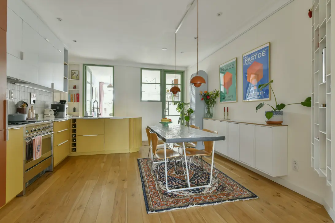 Aan de voorzijde van het appartement geniet u van vrij uitzicht over groen vanuit de erker met glas-in-lood. De authentieke en-suitedeuren (met ingebouwde boekenkasten) scheiden de voorkamer van de keuken.