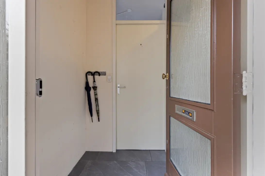 De entree van de woning biedt toegang tot het toilet en de woonkamer met open keuken.