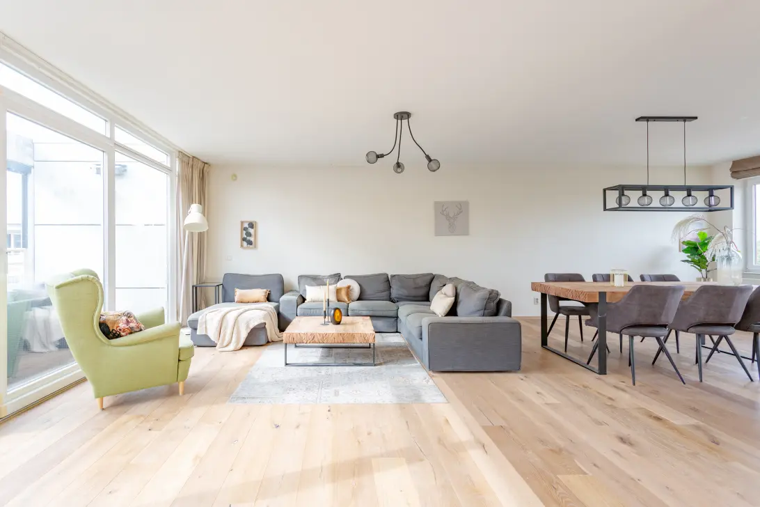Fifth Floor:Thanks to its smart layout, the apartment offers generously sized rooms. The entrance hall provides access to the guest toilet, a bathroom with shower and washbasin, and a laundry/utility room with central heating, washing machine, and dryer connections. This space could easily be converted into a home office. The spacious living room features double sliding doors opening onto the south-facing terrace (7.25 x 2.40 m) with a view of the courtyard. The terrace is equipped with sun blinds and heating. At the front of the apartment is the large semi-open kitchen. The luxurious kitchen comes with ample storage, glossy cabinets, and a composite countertop, fitted with Siemens appliances: gas hob with wok burner, extractor hood, fridge/freezer combination, warming drawer, built-in coffee machine, Quooker, dishwasher, combi-microwave, and oven. The apartment offers three generous bedrooms in total, one of which has an en-suite bathroom with a walk-in shower, toilet, and double washbasin. The house has a recently renovated oak wooden floor throughout.