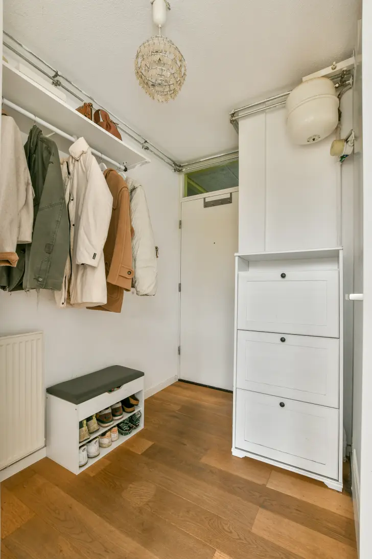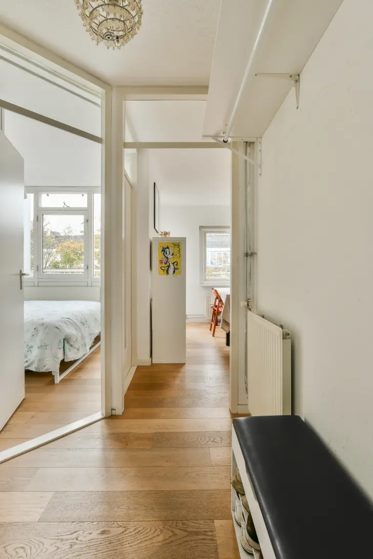 Entree via het nette ruime trappenhuis vind je op de vierde etage de entree van de woning. Je komt binnen in de hal en vanaf hier krijg je toegang tot alle vertrekken in de woning.