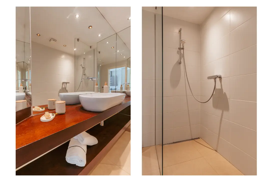 Via het gemeenschappelijk trappenhuis bereik je de woning op de vierde verdieping. De hal geeft toegang tot de lichte keuken met uitzicht op de binnentuinen, voorzien van diverse inbouwapparatuur en een wasmachineaansluiting. Vanuit de hal ook toegang tot de moderne badkamer met inloopdouche, houten wasmeubel en dimbare verlichting.
