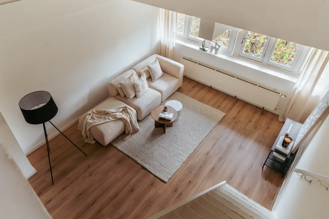 - Karakter: Loft achtige woonkamer, zichtbare balken, speelse indeling en originele details;