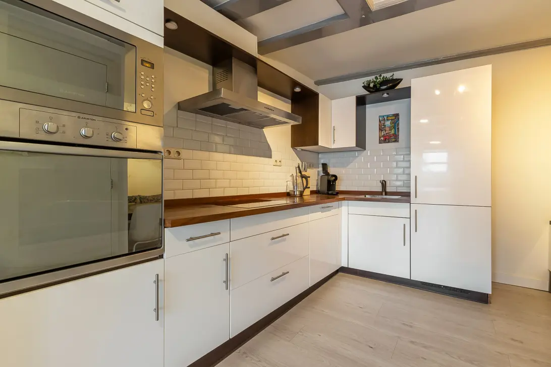 Aan de achterzijde bevindt zich de woonkeuken, welke is voorzien van diverse inbouwapparatuur, waaronder een koel-/vriescombinatie, oven, separate magnetron en een inductiekookplaat met afzuigkap.