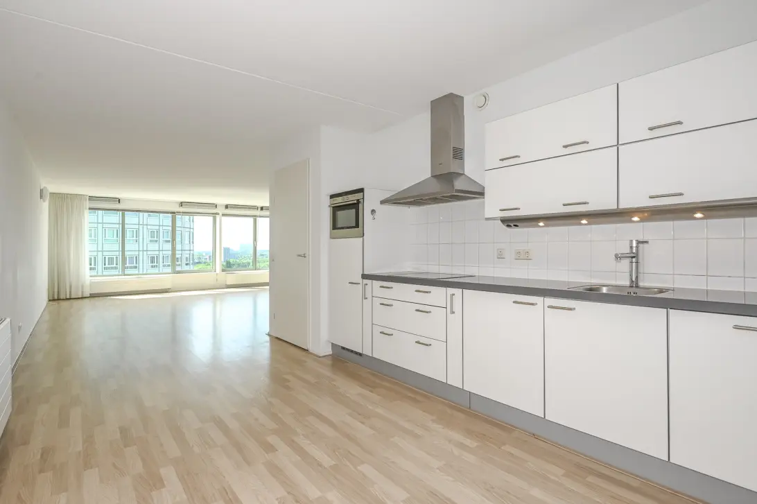 U komt binnen in het gebouw via de statige, gemeenschappelijke entree met liften en trappen naar de verdiepingen. Entree van het appartement op de 16e verdieping met allereerst de hal, met modern toilet met fontein en berging met aansluiting voor de wasmachine. Vervolgens bereikt u de ruime woon-/eetkamer met grote raampartijen die voor een fraai en weids uitzicht zorgen. Aansluitend de moderne semi-open keuken, voorzien van een kookplaat, afzuigkap, koelkast, vaatwasser en toegang tot een ruime berging met losse vriezer. Er zijn twee royale slaapkamers, beiden met toegang tot het terras. Tenslotte de badkamer, voorzien van een ligbad, aparte douche, twee wastafels en een tweede toilet.