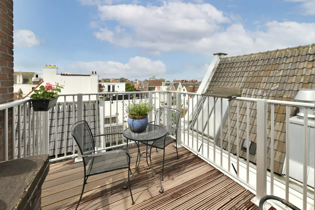 From the room at the rear, a staircase leads to the fourth floor with a quiet bedroom featuring built-in wardrobes, a fresh marble bathroom with walk-in shower, washbasin and second toilet, and access to the second west-facing roof terrace. This roof terrace has hardwood flooring and aluminium fencing all around. From here, you also have a very special view of the city's unique rooftop landscape! The two roof terraces are located at the quiet rear, which means that in addition to great views and sunshine, it is also an oasis of tranquillity in the middle of the city!