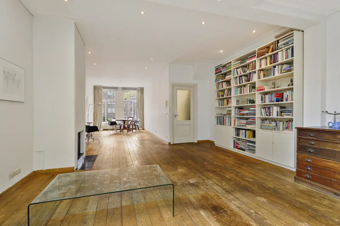 Vanaf de straat biedt een stenen trap toegang tot het portiek met hier de voordeur naar de bel-etage. Via een halletje komt u de ruime woonkamer binnen. Door de opmerkelijke diepte van het appartementsrecht bevinden zich de ruimtes zich achter elkaar van voor naar achter: Woonkamer, open keuken, binnentuin, separaat toilet, de eerste slaapkamer met eigen badkamer en als laatste de tweede slaap- en badkamer combinatie.