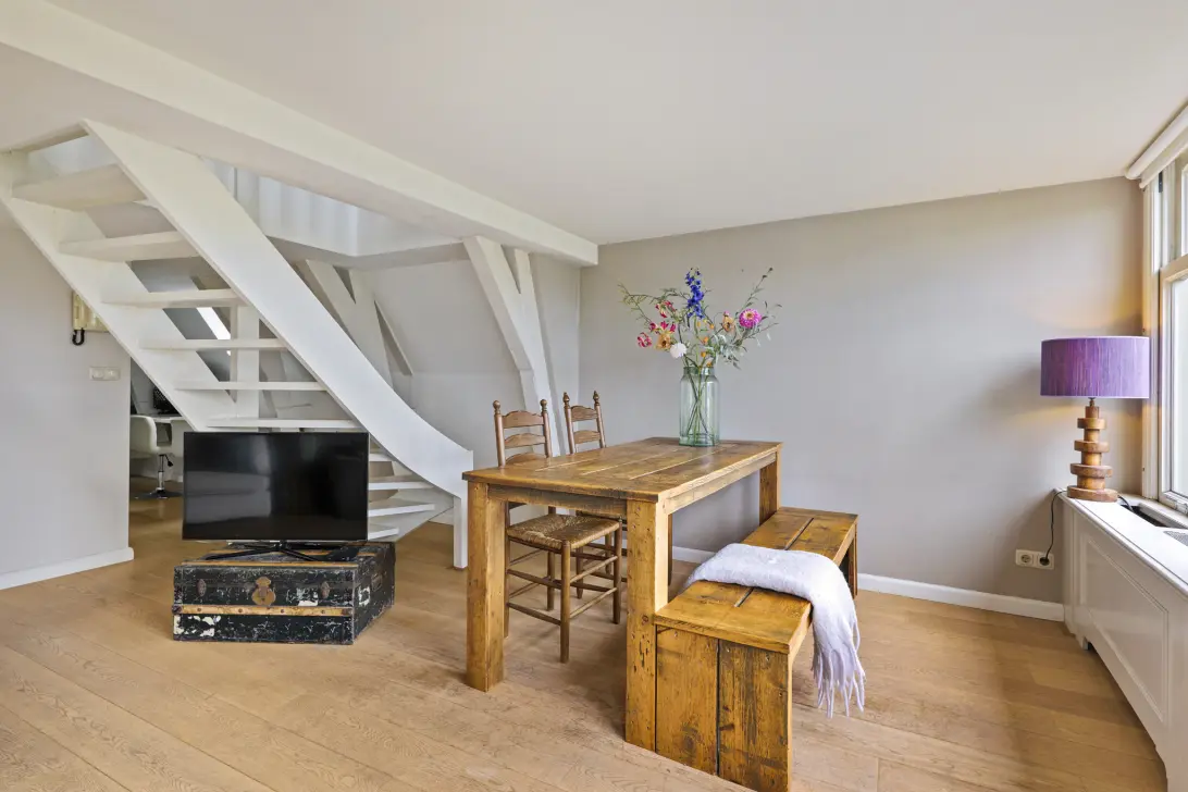 De open trap aan de voorzijde brengt u naar bovengelegen slaapverdieping, tevens de bovenste verdieping van het pand. Aan zowel de voor- als achterzijde is een goede slaapkamer. De kamer aan de voorzijde is ietwat verhoogd en beschikt aan weerszijde over een plafondhoge inbouwkastenwand. De slaapkamer aan de achterzijde is via een schuifdeur te bereiken. Deze kamer biedt toegang tot het knusse dakterras van 6m². Vanuit hier heeft men fantastisch zicht op de daken van de binnenstad. Het midden van deze verdieping beslaat een ruime overloop voorzien van een Velux raam, een brede op maat gemaakte inbouwkast en toegang tot de badkamer. De badkamer is geheel wit van uitvoering en is voorzien van een ligbad, separate douche, houten wastafelmeubel en het toilet. Prettig detail zijn de twee brede ramen in de badkamer.