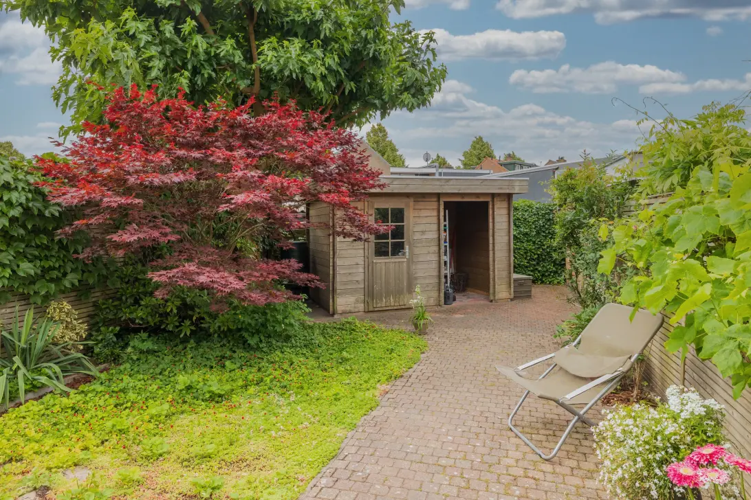 De achtertuin ligt op het zonnige zuidwesten en is verrassend diep. Hier kun je genieten van lange zomerse avonden in alle rust en privacy. De vrijstaande houten schuur biedt plek voor fietsen en tuingereedschap en is bereikbaar via de handige achterom.