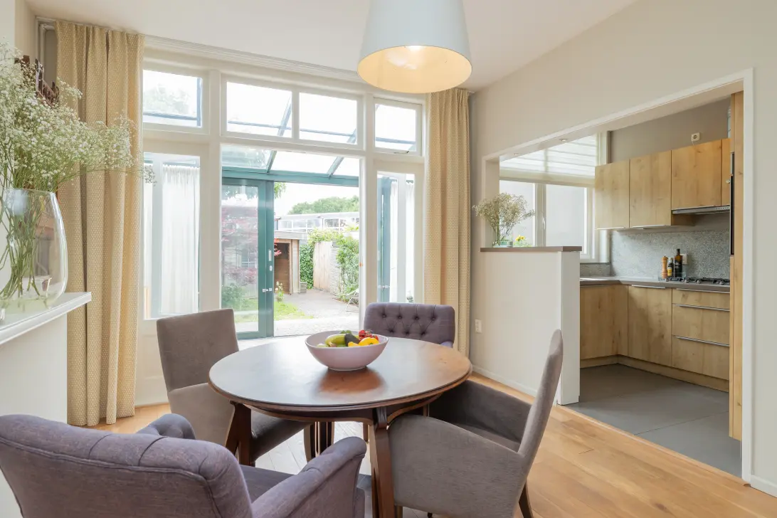 De woning beschikt over een lichte, brede woonkamer met grote raampartijen en een sfeervolle houten vloer. De open keuken is netjes afgewerkt en biedt volop kastruimte en werkoppervlak. Aansluitend bevindt zich een gezellige serre, die in verbinding staat met de tuin. Deze ruimte is perfect geschikt als werkplek of speelruimte en is het hele jaar door een fijne plek om te vertoeven.