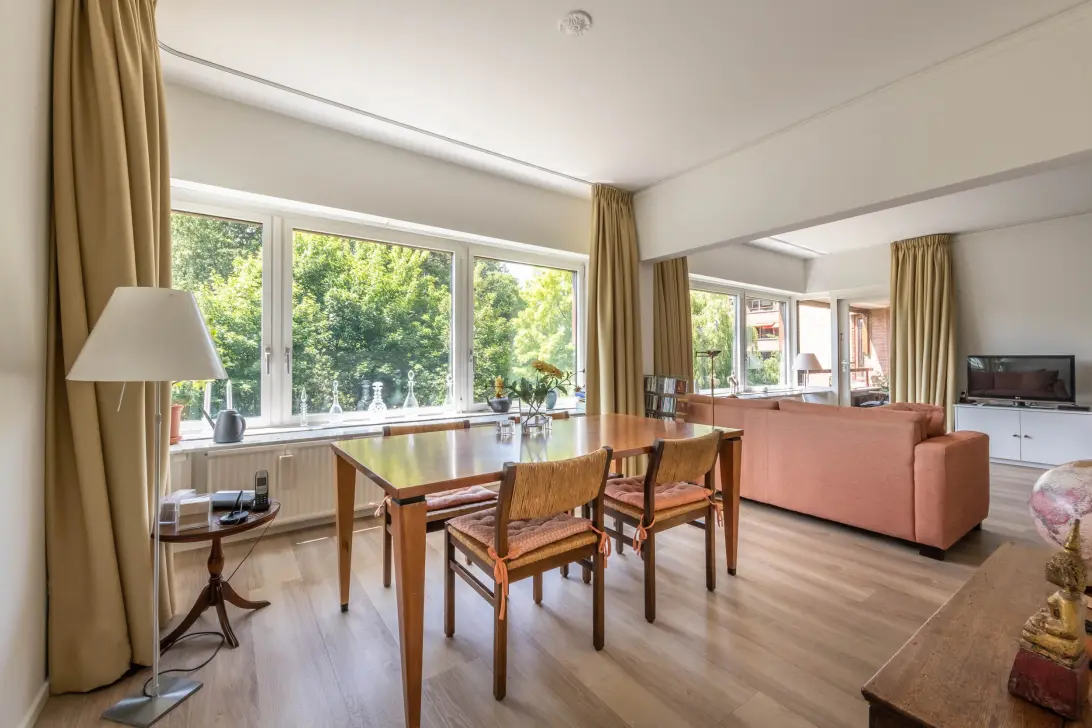 De lichte woonkamer heeft een houtlook eiken vloer en ramen over de volle lengte waardoor de zon de hele dag naar binnen valt (elektrische zonwering beschikbaar). Ook is er een grote ingebouwde boekenkast. De indeling maakt het mogelijk een comfortabel zitgedeelte te combineren met een ruime eethoek naast de open keuken.