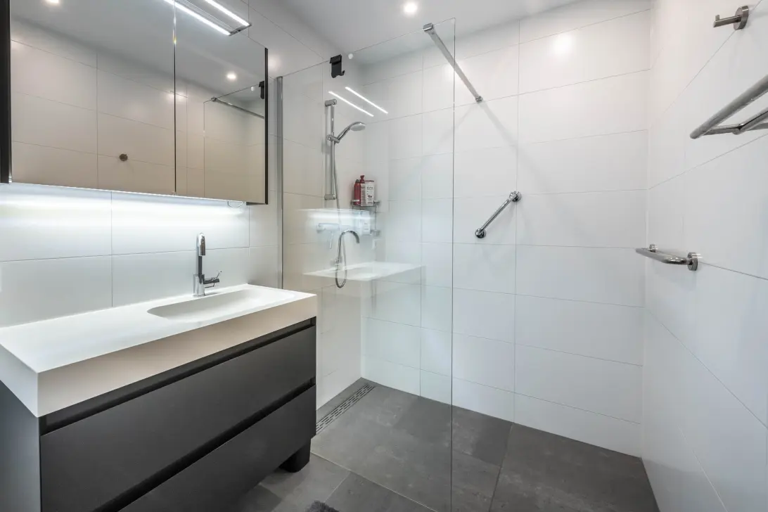De badkamer beschikt over een brede inloopdouche, een fraai wastafelmeubel met spiegel en verlichting, en een designradiator.