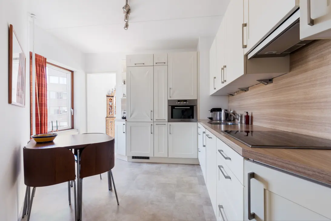 De moderne keuken met voldoende ruimte voor een eettafel is zowel bereikbaar vanuit de hal als de woonkamer, en is voorzien van diverse moderne inbouwapparatuur en voldoende opbergruimte.