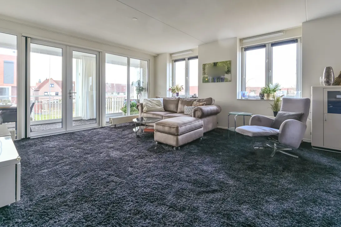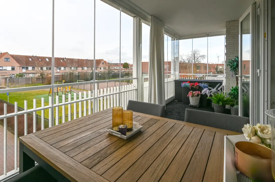 Middels openslaande deuren naar een royaal balkon / zonneterras op het westen met (in delen) wegklapbare ramen. Dit maakt de buitenruimte zeer comfortabel; u kunt al heel vroeg buiten zitten, indien gewenst uit de wind of als fijn verlengstuk van de woonkamer gebruiken.