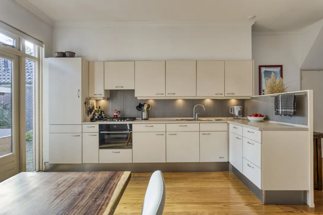 De woning zelf ademt authenticiteit, met een fraaie gevel, een authentieke voordeur en sfeervol metselwerk. De hoge plafonds in de woonkamer geven een gevoel van ruimte en de houtkachel in de schouw maakt het extra knus. De L-vormige keuken sluit mooi aan op de leefruimte en via de openslaande deuren stap je zo de zonnige achtertuin in. De badkamer op de begane grond is modern afgewerkt en voorzien van een wastafelmeubel, douche en separaat toilet. Achter de woning vind je een diepe tuin met meerdere terrassen en volop groen, waar je elk moment van de dag een fijne zitplek kunt creëren. Het geheel verkeert in een verzorgde staat en sluit perfect aan bij de landelijke, romantische sfeer.