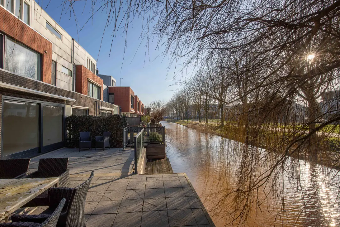 Het zonnige terras op het zuidwesten vormt een verlengstuk van de leefruimte en biedt een heerlijke plek om tot rust te komen. De ligging aan het water zorgt voor een vrij en groen uitzicht.