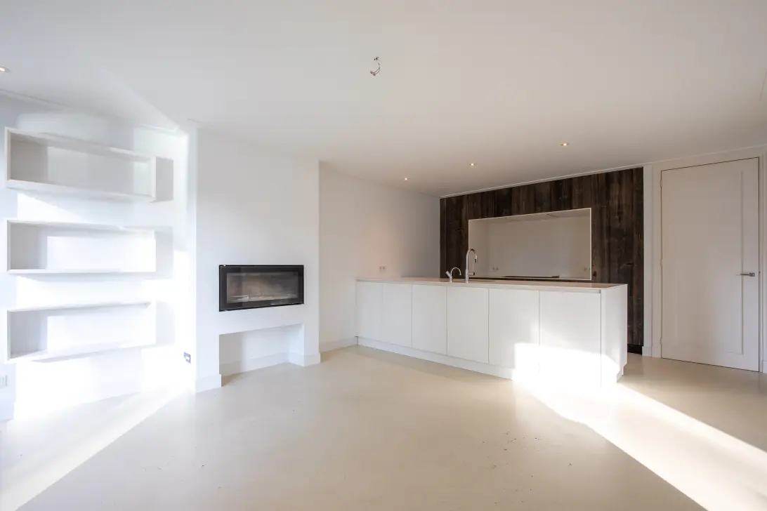 De royale woonkamer strekt zich uit over de volle breedte van de woning en wordt gekenmerkt door grote raampartijen en een prettige lichtinval. Aan de achterzijde zorgt een brede schuifpui voor een fraaie verbinding met het terras aan het water, waar een comfortabele zithoek is gecreëerd met uitzicht op de omgeving. Aan de voorzijde van de woning bevindt zich een tweede zithoek met een fijne werkplek en een praktische inbouwkast.