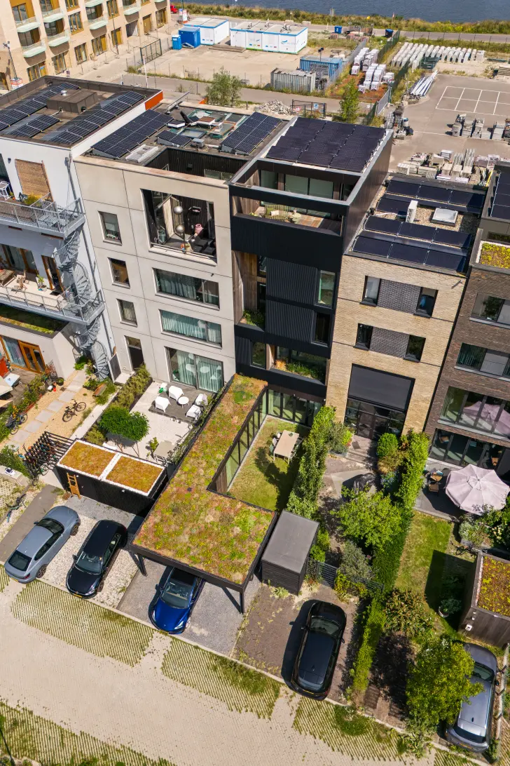 - Duurzame, rainproof daken: groen sedum (als waterbuffer)