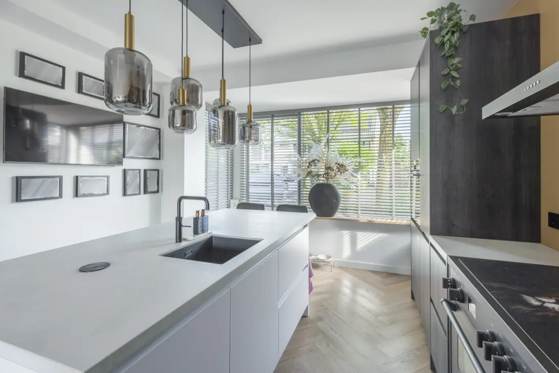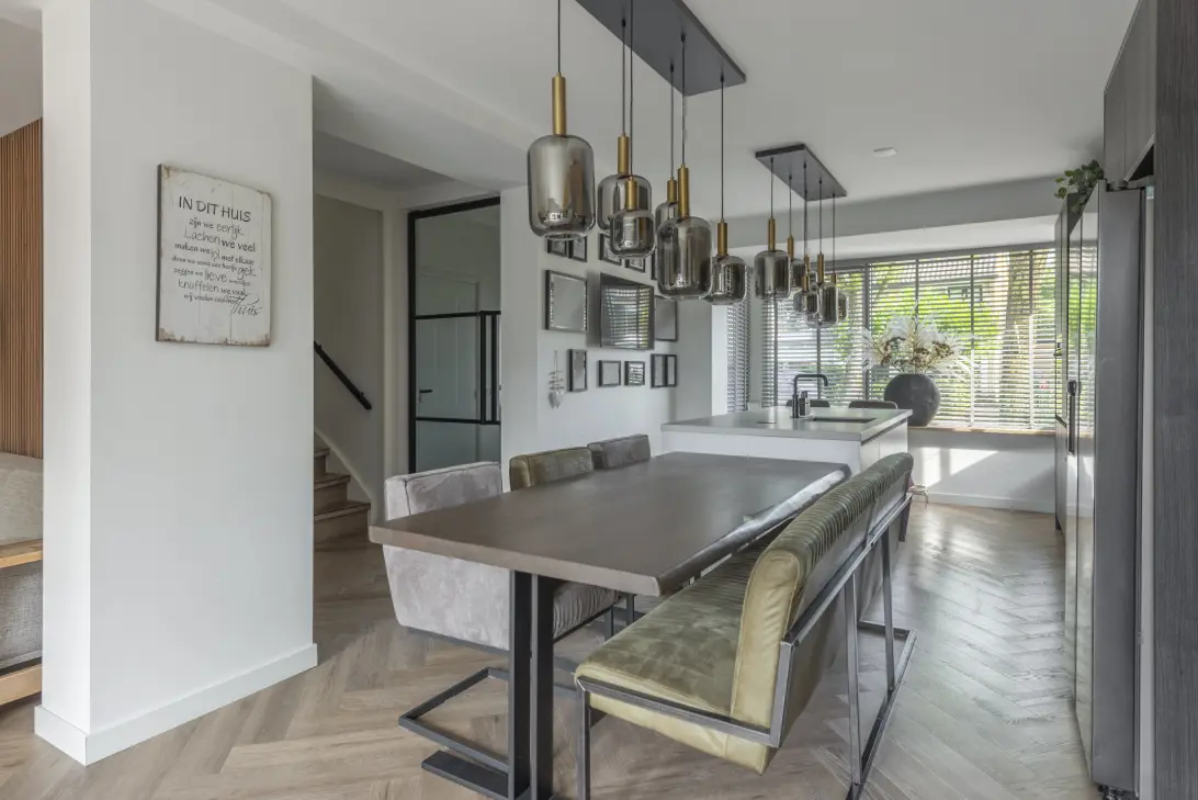 Via de hal met modern toilet kom je in de ruime, lichte woonkeuken – het hart van de woning – met plek voor een grote eettafel. Aan de tuinkant vind je een gezellige zithoek met openslaande deuren naar de tuin.