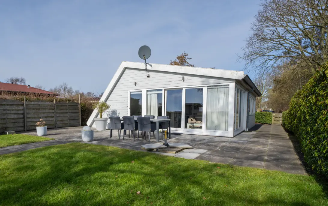 Als je dan op een recreatiepark een woning wilt kopen, dan het liefst aan de rand van het park. Nu, dit is zo'n plek. Aan de zuidzijde van het park nog maar liefst. En dat levert een prachtig vrij uitzicht op over landerijen waar op dit moment de schapen rondlopen.
