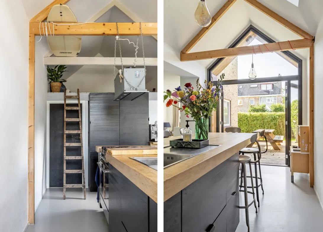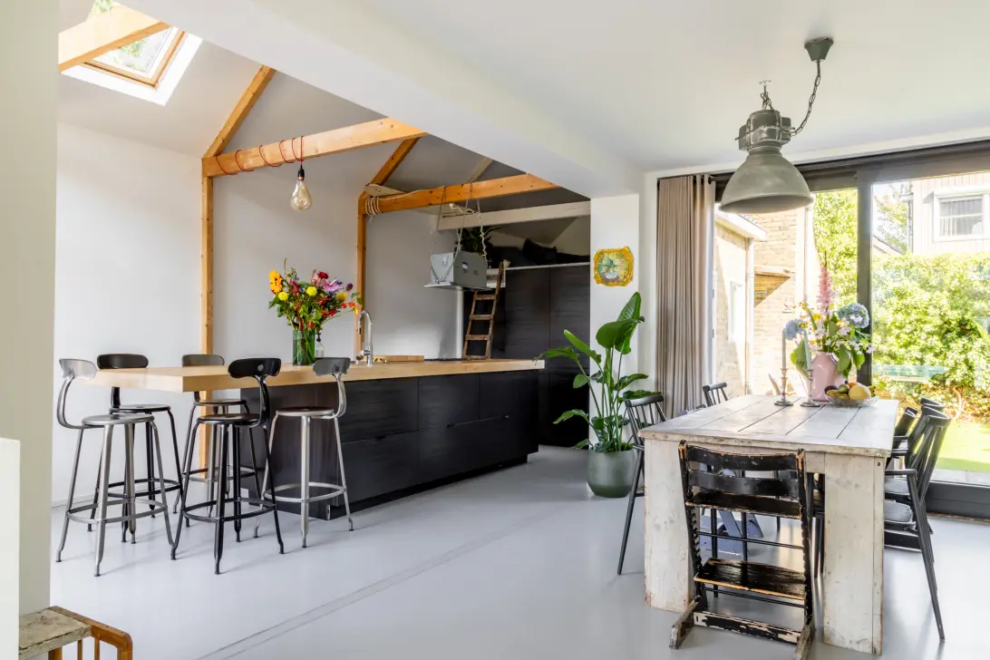 Entree met hal en toilet. De ruime woonkamer is voorzien van een stijlvolle gietvloer en een prachtige open keuken met kookeiland en vloerverwarming. De keuken beschikt over diverse inbouwapparatuur, waaronder een Quooker, vaatwasser, oven, koelkast en vriezer. Via een zijdeur is deze ruimte ook direct bereikbaar. Achter de keuken bevindt zich een extra kamer die ideaal te gebruiken is als berging of studeerkamer. Boven deze ruimte ligt een vide, perfect als extra opslag of als speelhoek voor kinderen.