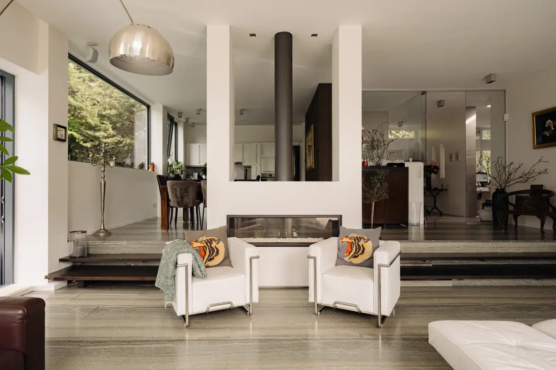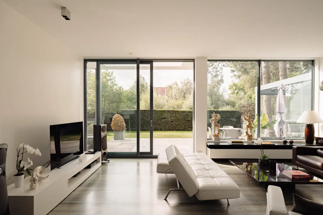 Bij binnenkomst valt meteen de aangename lichtinval op, dankzij een glazen wand die de hal verbindt met de woonkamer. De indrukwekkende plafondhoogte, natuurstenen vloer en het panoramische uitzicht op de tuin zorgen voor een wow-effect. Dankzij de schuifpui en grote raampartijen, die grotendeels reiken van vloer tot plafond, vloeien binnen en buiten naadloos in elkaar over. Het royale terras en de fraai aangelegde tuin worden zo onderdeel van de leefruimte.