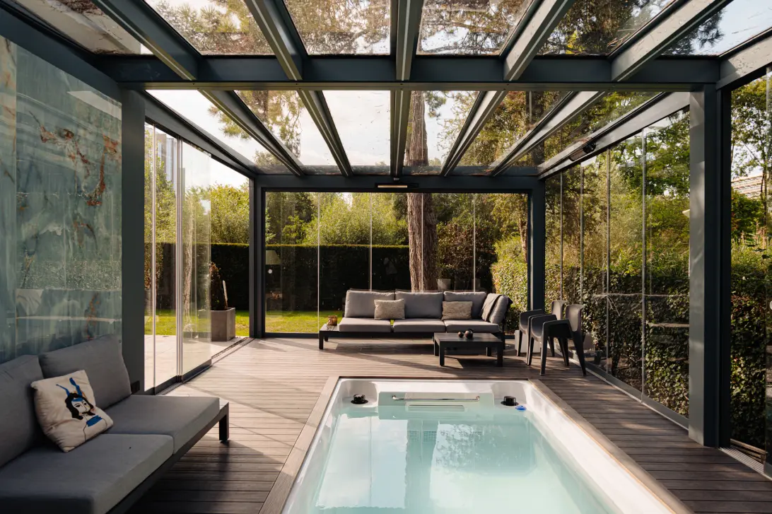 Vanuit de woonkamer loop je zo de lichte serre in met inpandig zwembad voorzien van jetstream. De glazen wandpanelen kunnen volledig open, waardoor je hier – van het vroege voorjaar tot in het najaar – optimaal van de zon en het buitenleven geniet.