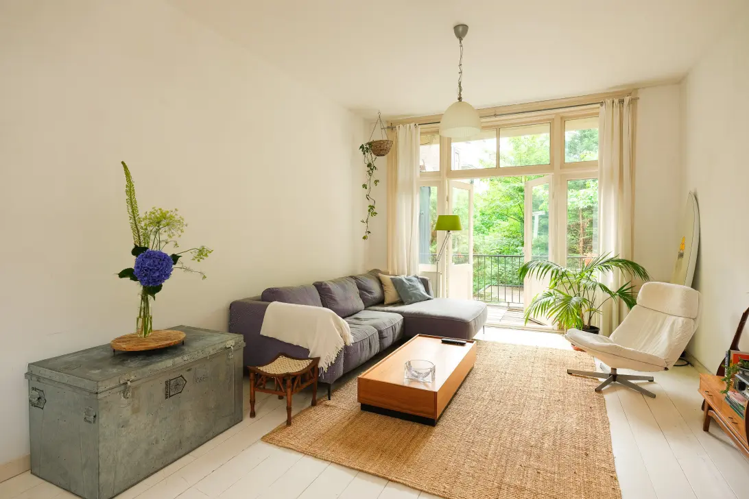 The spacious living room is characterized by its good dimensions of almost 35 m2, the beautiful light and a height of over 3 meters; there is a beautiful wooden floor on the floor. At the rear there are double doors to the sunny balcony facing south/southeast with a lovely green view of the inner gardens and the sound of chirping birds. At the front there is a small second balcony with the sun at the end of the day in the summer. The two bedrooms are located at the front of the house and also have a beautiful wooden floor. Both rooms are of good size, with the same height of over 3 meters and the second bedroom has a loft bed. The spacious and robust kitchen is L-shaped and equipped with (built-in) appliances and a classic sideboard. The equally large bathroom has a bath, shower, sink and connection for the washing machine and there is a separate toilet.