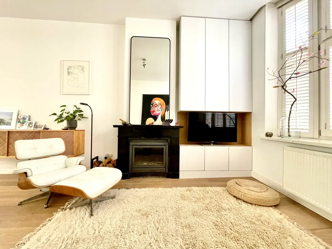 The home can be accessed directly from the street. The entire ground floor is fitted with a beautiful oak floor, and upon entering, the abundant natural light immediately stands out: tall windows on both sides, a classic bay window at the front, and elegant shutters create both atmosphere and control of daylight.