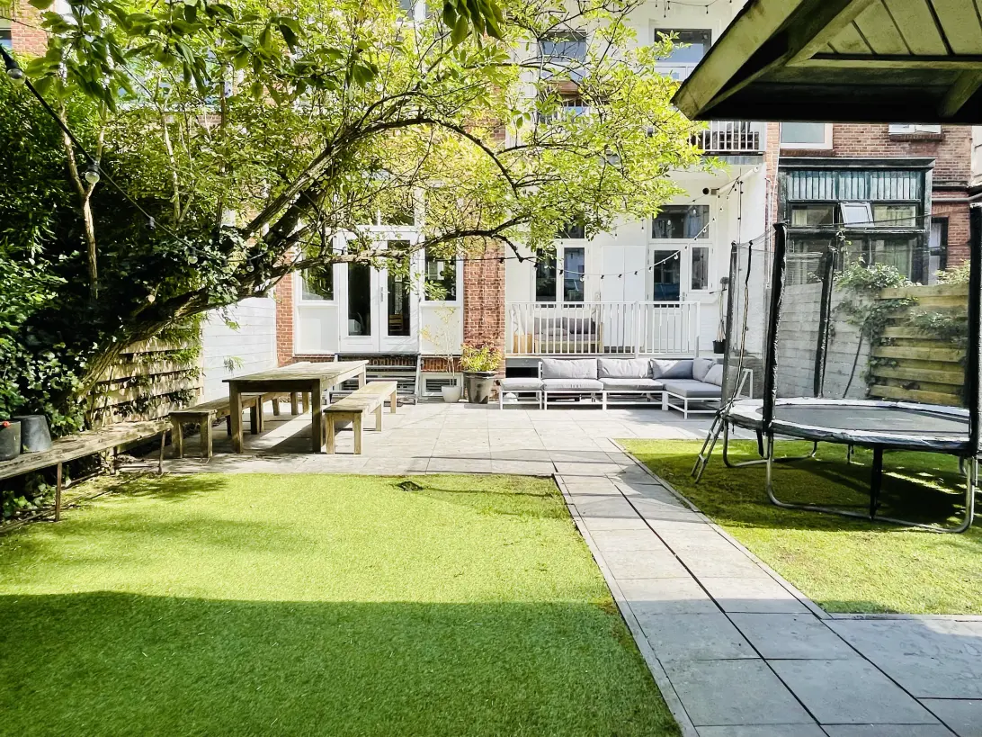 The sunny southwest-facing garden of approx. 110 m² offers more than enough room for a large dining table, lounge area, multiple sunbeds, a trampoline, and of course the well-finished garden house — ideal as a home office, studio, or storage. A beautiful Japanese cherry blossom tree adds charm every spring when it blooms and colors the garden pink.
