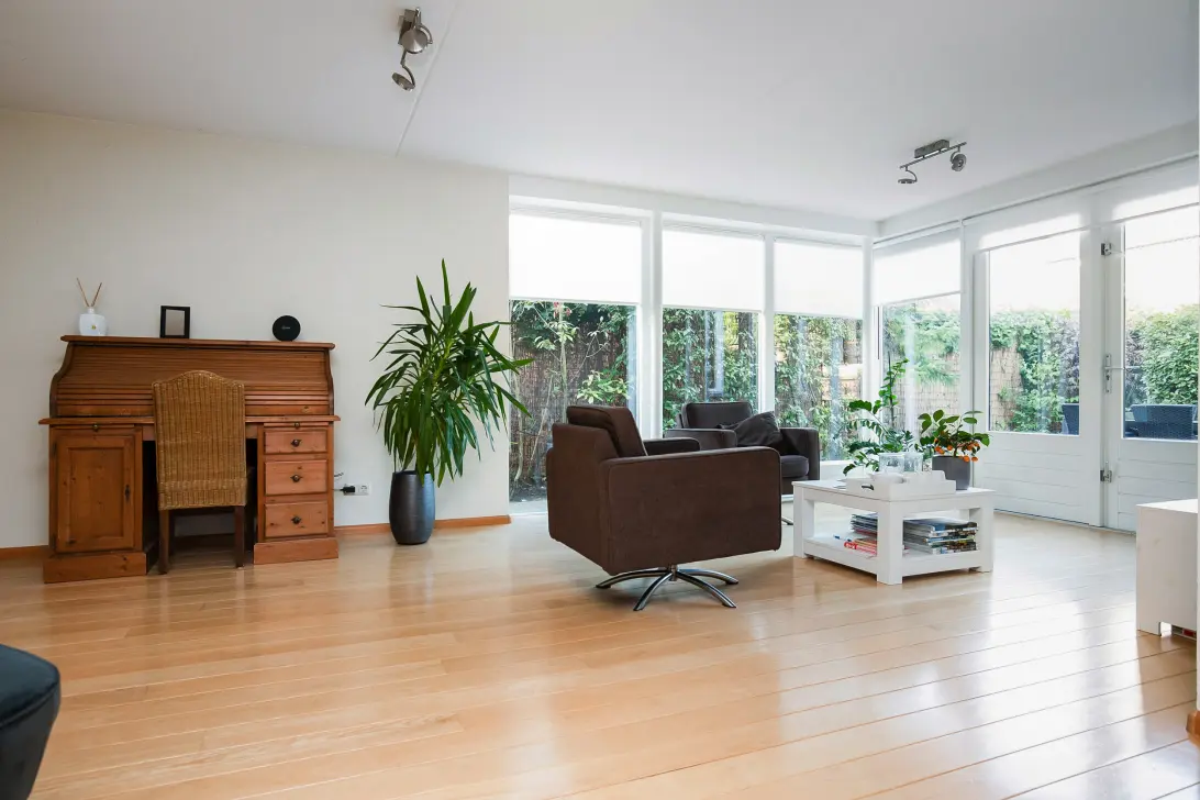 Buiten: de onderhoudsvriendelijke voortuin op het zuidoosten heeft parkeergelegenheid op eigen terrein voor de voormalige garage welke gesplitst is in een berging en kantoorruimte. De circa 15 meter diepe achtertuin op het noordwesten is aangelegd met veel groen, diverse terrassen en een overkapping.