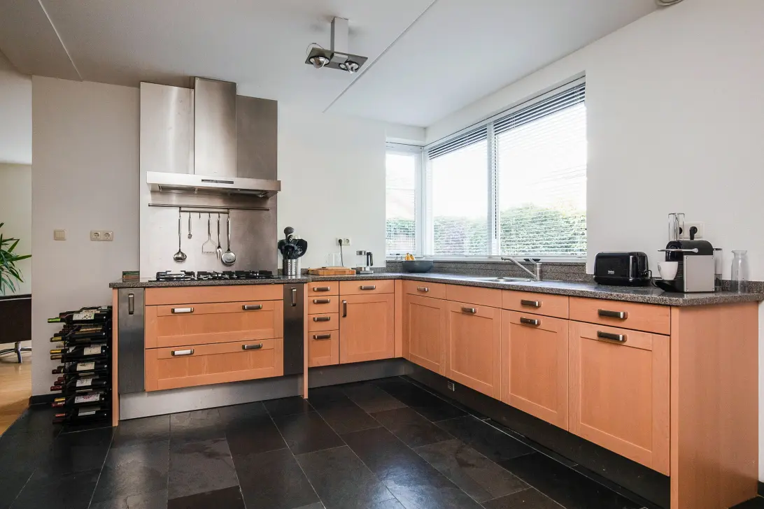 De keuken in L-opstelling is uitgevoerd met onder- en bovenkasten en diverse inbouwapparatuur, te weten: 5-pits gaskookplaat, afzuigkap, oven, koel-vriescombinatie en vaatwasser. Vanuit de aangrenzende bijkeuken met veel bergruimte heeft u toegang tot de achtertuin en de kantoorruimte.