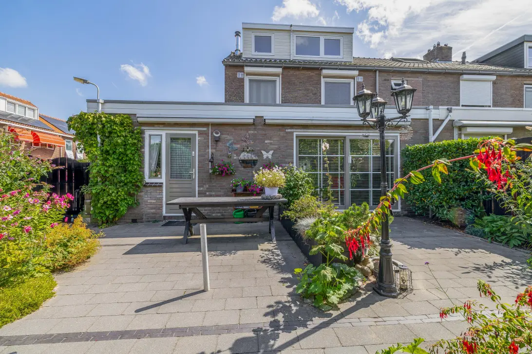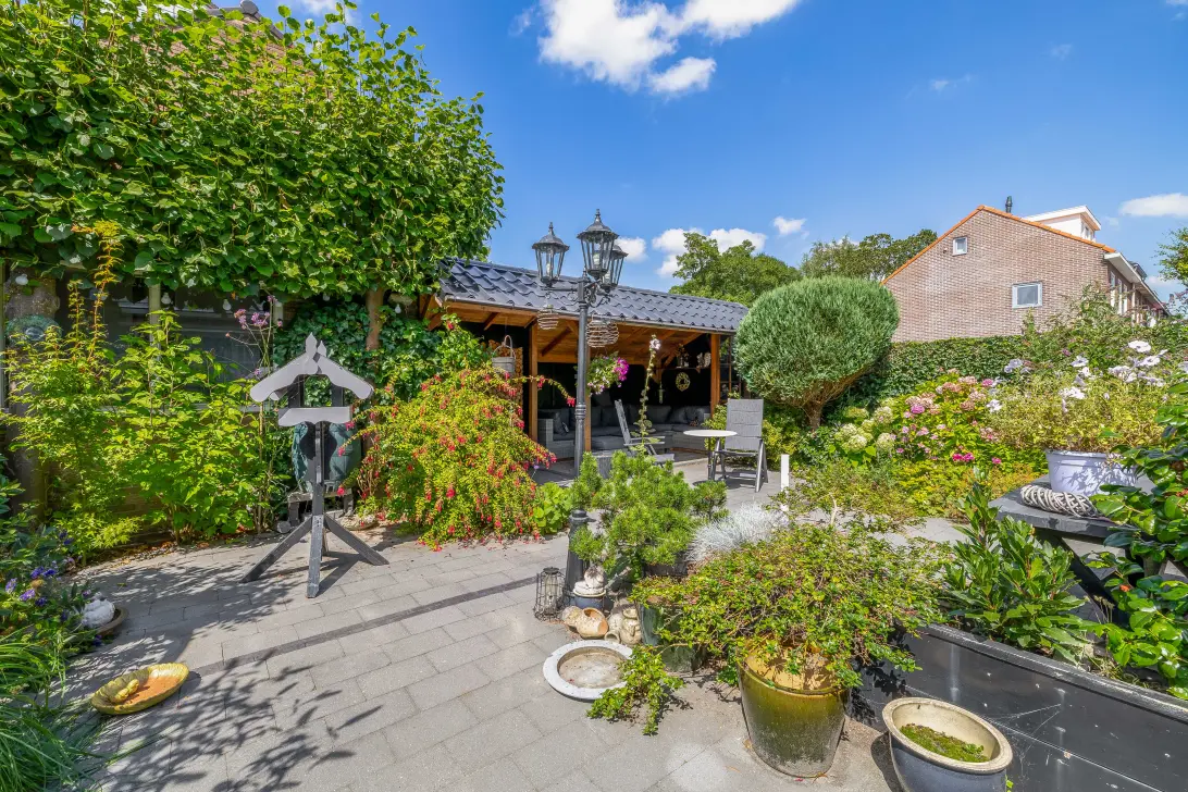Vanuit de woonkamer en keuken loop je de brede tuin in, waar de zon volop op de terrassen schijnt. Er zijn twee terrassen gemaakt, en de kapschuur biedt ruimte aan het derde terras. Waar je ook zit in de tuin, er is veel groen te zien. Niet alleen in de kleur groen, maar ook bloemen in andere prachtige kleuren. Dit is geen tuin, maar een droomtuin waar het leven goed is!