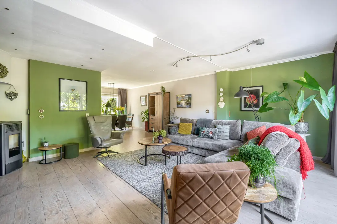 Verrassend is de woonkamer, met een grote aanbouw aan de achterzijde. Het gezellige eetgedeelte, met de ochtendzon, is aan de voorzijde en het zeer ruime zitgedeelte aan de achterzijde. De pelletkachel staat op de plek waar vroeger de keuken was, maar die vind je nu achter de dubbele deuren. Verder zie je een grote schuifpui naar de tuin, waardoor binnen en buiten optimaal verbonden zijn.