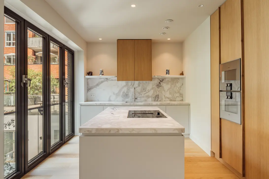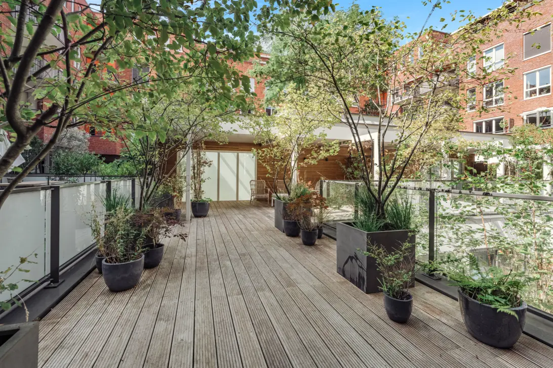First floor: entrance hall with coat closet and toilet. Very spacious living room with water views, stylishly fitted with wooden floors. Dining room with a luxurious eat-in kitchen featuring beautiful marble details, a bar area perfect for breakfast or drinks, and Gaggenau appliances. French doors from the dining room open onto a beautifully landscaped roof terrace with afternoon sun.